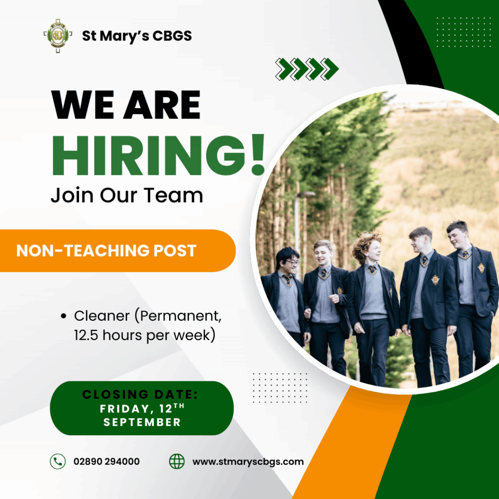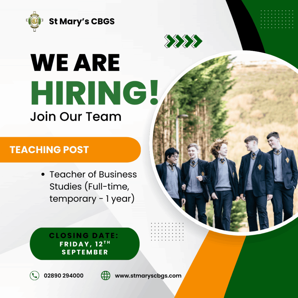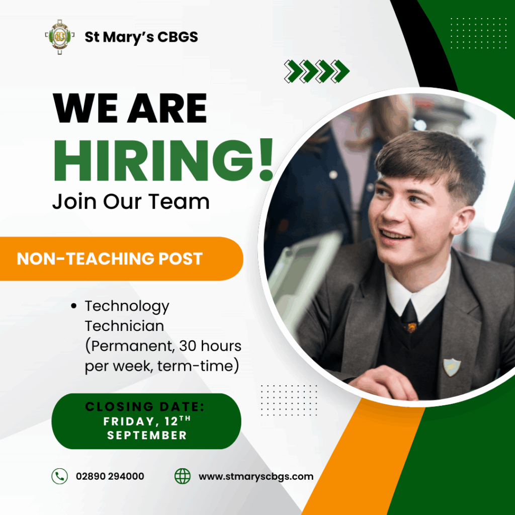 St Mary’s CBGS currently has three exciting job openings: Teacher of Business Studies, Cleaner, and Technology Technician. All positions have a closing date of Friday, 12th September and offer excellent opportunities to work in a supportive school environment.